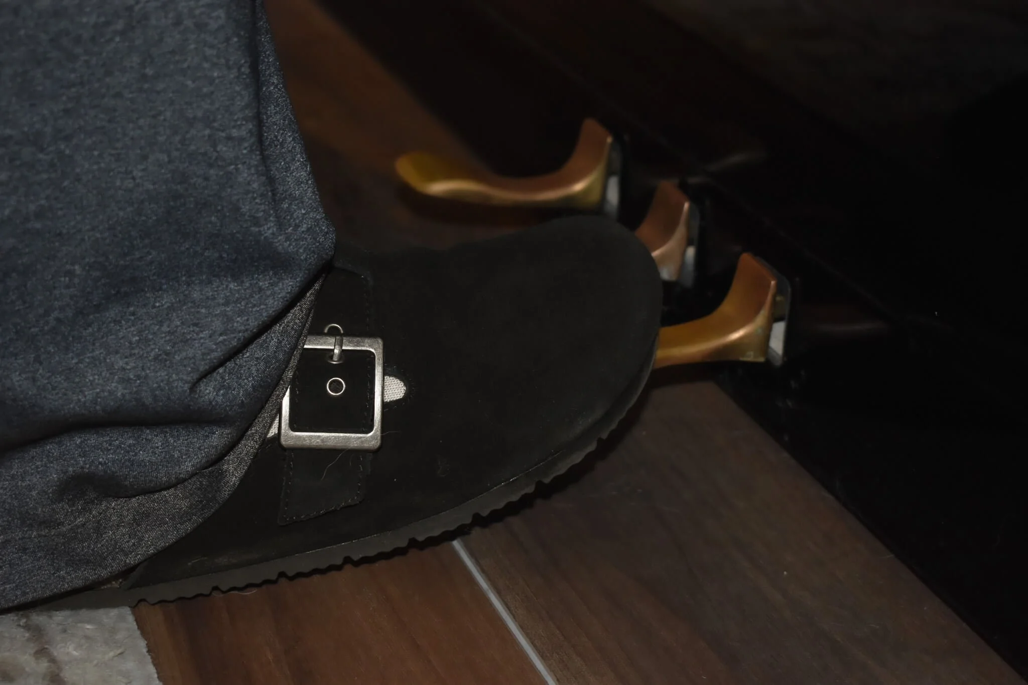 Next, let’s look at your foot placement. We only use our right foot when using the damper pedal. Our left foot serves as a stabilizing force on the ground, or (occasionally) to engage our other pedals or page-turning foot switch. Your right foot should only cover 60% of the pedal, not 100%, to give you more control with your pedal changes. And your right heel should always be on the ground while pedaling; this helps you conserve your strength (lifting your toes takes much less effort than lifting your entire leg!) as well as provides you with more stability.